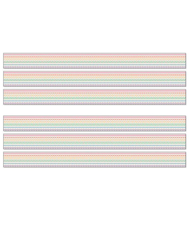 Add a rainbow of color to your classroom decor by decorating your learning space with Carson Dellosa's Crafty and Cool Rainbow Stitch Bulletin Board Borders! Each pack of border includes 12 strips of bulletin board border with a boho rainbow stitch design on each border trim. Each strip of rainbow bulletin board border measures 3' x 3" for a total of 36ft per pack to dress up lockers, cubbies, bulletin board, cork board, and white board displays with ease. The classroom border is printed on thick but flexible bulletin board paper that you can cut and layer to add dimension to any display. Sold as 6 packs for a total of 72 strips (216 ft).