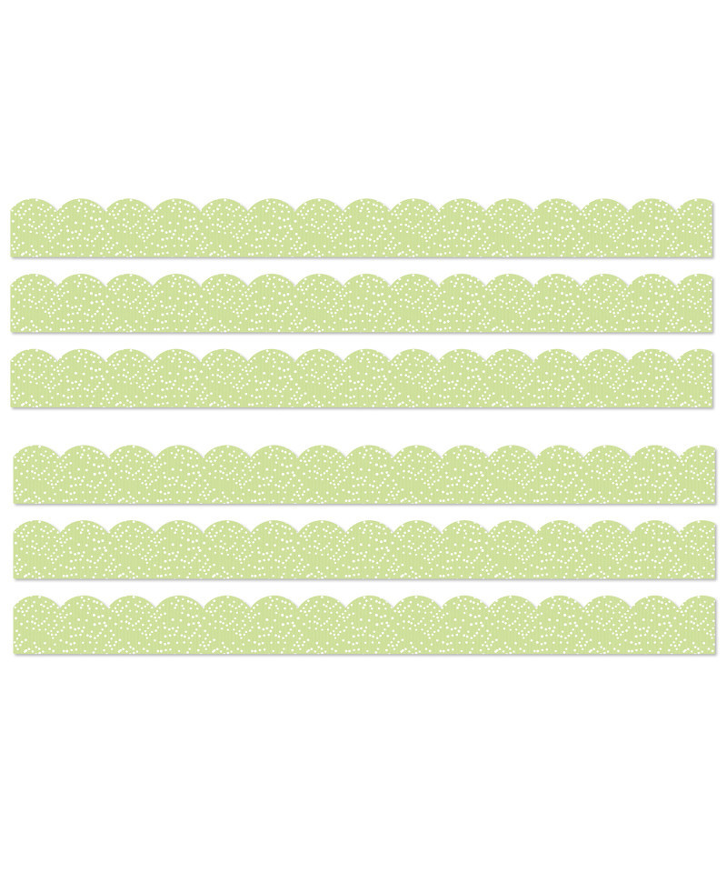 Add a pop of color to your classroom décor with Carson Dellosa's Crafty and Cool Green Polka Dots Bulletin Board Borders! Each border pack includes 13 strips of scalloped, green bulletin board border with a white polka dot design on each border trim. Each strip of border measures 3' x 3" for a total of 39ft per pack to dress up lockers, cubbies, bulletin board, cork board, and white board displays with ease. The classroom border is printed on thick but flexible bulletin board paper that you can cut and layer to add dimension to any display. Sold as 6 packs for a total of 78 strips (234 ft).