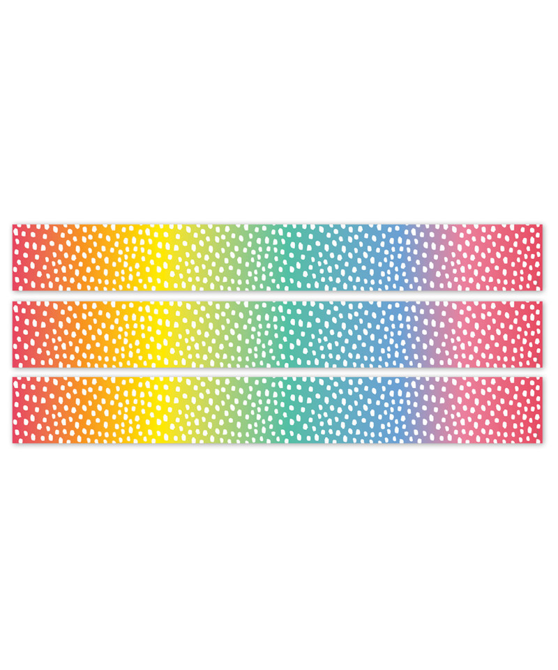 COLORFUL RAINBOW DESIGN – The colors of the rainbow blend together on this border, which is speckled with messy white dots.