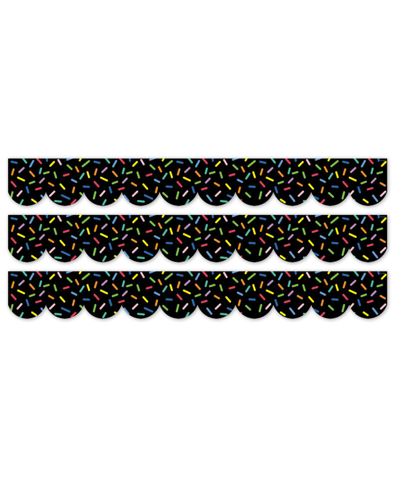 FESTIVE DESIGN – This borders colorful sprinkles on a black background evokes happy celebrations and sweet treats, and it is sure to add pizzazz to any bulletin board.