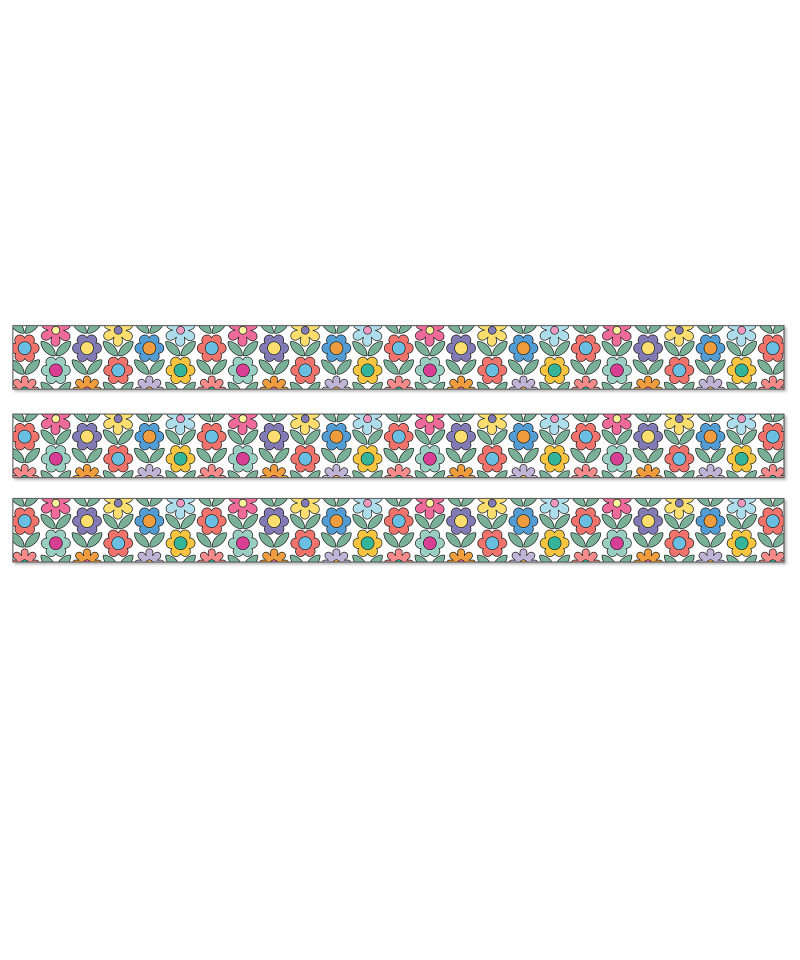 Watch your classroom décor bloom to life with the help of Retro Remix Flower Bulletin Board Borders! The border bundle includes 12 strips of straight bulletin board border with a vibrant floral design on each border trim. Each strip of groovy border measures 3' x 3" for a total of 36ft to dress up lockers, cubbies, bulletin board, cork board, and white board displays with ease. The classroom border is printed on thick but flexible bulletin board paper that you can cut and layer to add dimension to any display. Retro Remix, designed by Stephanie and Loreal of @HappilyEverElementary, partnered with Carson Dellosa to bring some fun, retro vibes to your learning environment. Sold as 3 packs, with 36 ft per pack.