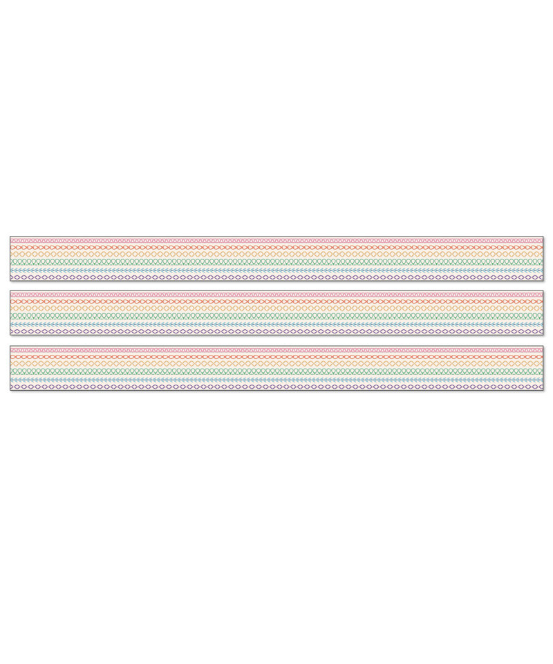 Add a rainbow of color to your classroom decor by decorating your learning space with Carson Dellosa's Crafty and Cool Rainbow Stitch Bulletin Board Borders! The border bundle includes 12 strips of bulletin board border with a boho rainbow stitch design on each border trim. Each strip of rainbow bulletin board border measures 3' x 3" for a total of 36ft to dress up lockers, cubbies, bulletin board, cork board, and white board displays with ease. The classroom border is printed on thick but flexible bulletin board paper that you can cut and layer to add dimension to any display. Sold as 3 packs, with 36 ft per pack.