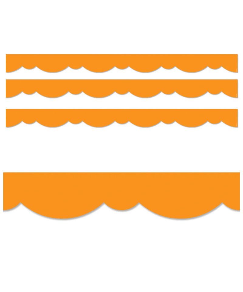 A fun, fresh twist on a solid border! This Orange Stylish Scallops EZ Border features a playful double scallop design to create a neat and easy way to edge any bulletin board or classroom display. Also great for use on bulletin boards in an office, a church, or a college dorm. With its versatile scallop design, this bulletin board EZ border can be used alone to create a basic look or layered with another border for a more designer look. These new EZ borders come in smaller strips, which are easier to manage and store. Each package comes with enough borders to complete 2 full bulletin boards. Use this orange EZ border for seasonal and holiday displays for summer, fall, Halloween, and Thanksgiving. Sold as 3 packs. Each pack includes 24 strips measuring 2-3/4" x 24" for a total of 48 feet.