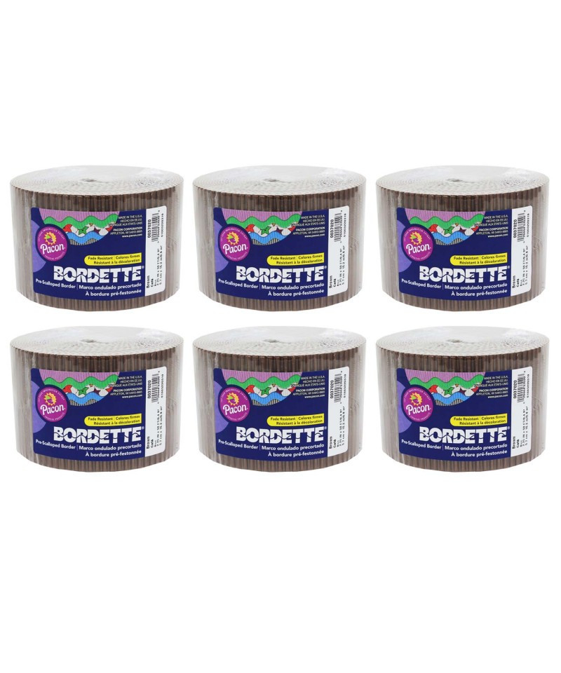 Bordette® is the original, pre-scalloped, fade-resistant decorative border. The sturdy corrugate provides a unique 3-dimensional appearance on any flat surface. It bends, molds, turns and twists to create unique layered designs. Packaged in a perforated roll, Bordette is easy to separate. It's easy to mix and match colors to create the perfect display. One 50' roll of Bordette will completely edge two 8' x 4' bulletin boards. Recyclable. Each roll includes 2.25" x 50'. Sold as a pack of 6 rolls.