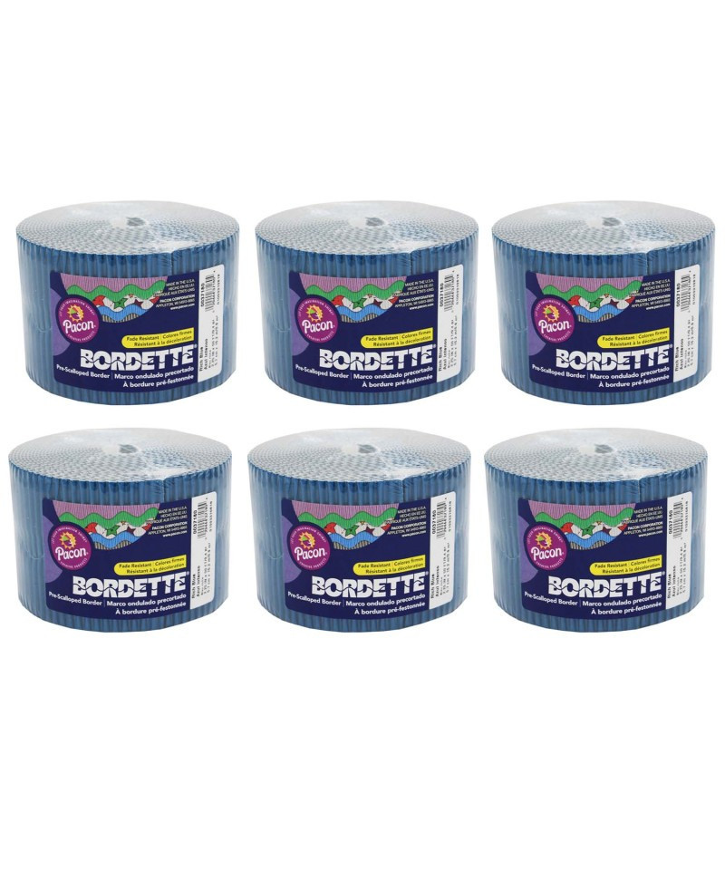 Bordette® is the original, pre-scalloped, fade-resistant decorative border. The sturdy corrugate provides a unique 3-dimensional appearance on any flat surface. It bends, molds, turns and twists to create unique layered designs. Packaged in a perforated roll, Bordette is easy to separate. It's easy to mix and match colors to create the perfect display. One 50' roll of Bordette will completely edge two 8' x 4' bulletin boards. Recyclable. Each roll includes 2.25" x 50'. Sold as a pack of 6 rolls.