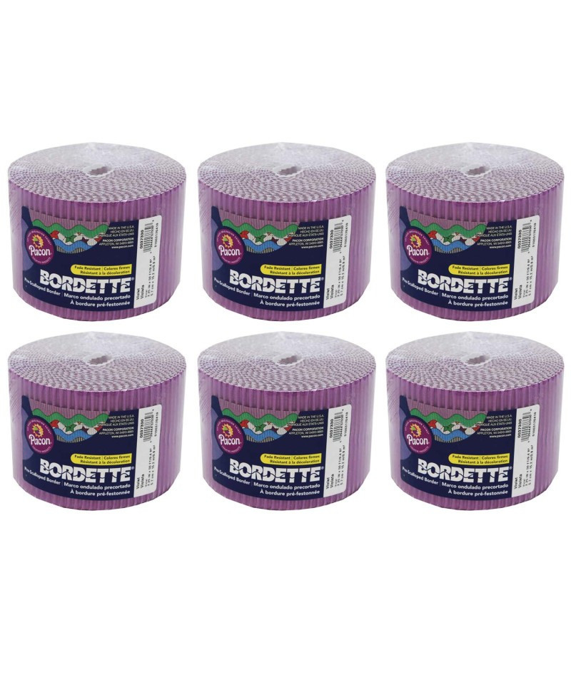 Bordette® is the original, pre-scalloped, fade-resistant decorative border. The sturdy corrugate provides a unique 3-dimensional appearance on any flat surface. It bends, molds, turns and twists to create unique layered designs. Packaged in a perforated roll, Bordette is easy to separate. It's easy to mix and match colors to create the perfect display. One 50' roll of Bordette will completely edge two 8' x 4' bulletin boards. Recyclable. Each roll includes 2.25" x 50'. Sold as a pack of 6 rolls.