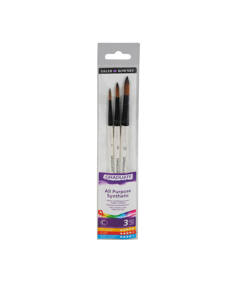 Daler-Rowney Graduate paintbrushes are an amazing choice for students & beginners, offering top-notch quality without breaking the bank. Made with durable synthetic bristles, these brushes hold their shape & give you precise control for smooth, even strokes. Plus, with a wide variety of brush types, you can easily explore different techniques & styles, making every painting session a creative adventure. Since 1783, Daler-Rowney has inspired professional artists, art students & hobbyists to embrace their creativity. We believe in producing art supplies that are sustainable, qualitative, durable, accessible & affordable. The Graduate product line is a premier collaboration between three renowned art supply brands—Canson, Lyra, and Daler-Rowney—offering a comprehensive range of high-quality art materials. Featuring an array of supplies including sketchbooks, pencils, and paints, each product is designed to enhance technical skill and artistic expression. Ideal for art students and teachers alike, the Graduate range provides the tools necessary for fostering creativity in the classroom. Short handle brushes include Round Sizes 4, 6, 8.