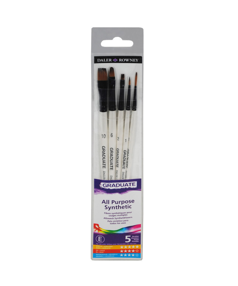 Daler-Rowney Graduate paintbrushes are an amazing choice for students & beginners, offering top-notch quality without breaking the bank. Made with durable synthetic bristles, these brushes hold their shape & give you precise control for smooth, even strokes. Plus, with a wide variety of brush types, you can easily explore different techniques & styles, making every painting session a creative adventure. Since 1783, Daler-Rowney has inspired professional artists, art students & hobbyists to embrace their creativity. We believe in producing art supplies that are sustainable, qualitative, durable, accessible & affordable. The Graduate product line is a premier collaboration between three renowned art supply brands—Canson, Lyra, and Daler-Rowney—offering a comprehensive range of high-quality art materials. Featuring an array of supplies including sketchbooks, pencils, and paints, each product is designed to enhance technical skill and artistic expression. Ideal for art students and teachers alike, the Graduate range provides the tools necessary for fostering creativity in the classroom. Short handle brushes include Flat (Size 2 & 10), Script Liner (Size 1), Round (Size 1), Oval (Size 6).