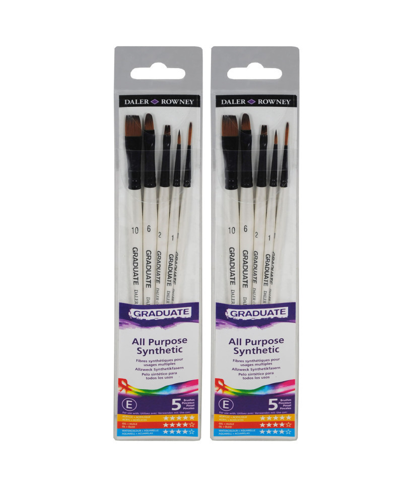 Daler-Rowney Graduate paintbrushes are an amazing choice for students & beginners, offering top-notch quality without breaking the bank. Made with durable synthetic bristles, these brushes hold their shape & give you precise control for smooth, even strokes. Plus, with a wide variety of brush types, you can easily explore different techniques & styles, making every painting session a creative adventure. Since 1783, Daler-Rowney has inspired professional artists, art students & hobbyists to embrace their creativity. We believe in producing art supplies that are sustainable, qualitative, durable, accessible & affordable. The Graduate product line is a premier collaboration between three renowned art supply brands—Canson, Lyra, and Daler-Rowney—offering a comprehensive range of high-quality art materials. Featuring an array of supplies including sketchbooks, pencils, and paints, each product is designed to enhance technical skill and artistic expression. Ideal for art students and teachers alike, the Graduate range provides the tools necessary for fostering creativity in the classroom. Each set includes short handle brushes Flat (Size 2 & 10), Script Liner (Size 1), Round (Size 1), Oval (Size 6). Sold as 2 sets for a total of 10 brushes.