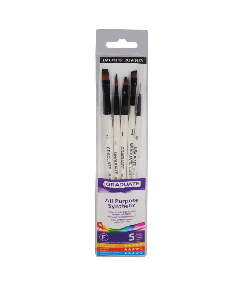 Daler-Rowney Graduate paintbrushes are an amazing choice for students & beginners, offering top-notch quality without breaking the bank. Made with durable synthetic bristles, these brushes hold their shape & give you precise control for smooth, even strokes. Plus, with a wide variety of brush types, you can easily explore different techniques & styles, making every painting session a creative adventure. Since 1783, Daler-Rowney has inspired professional artists, art students & hobbyists to embrace their creativity. We believe in producing art supplies that are sustainable, qualitative, durable, accessible & affordable. The Graduate product line is a premier collaboration between three renowned art supply brands—Canson, Lyra, and Daler-Rowney—offering a comprehensive range of high-quality art materials. Featuring an array of supplies including sketchbooks, pencils, and paints, each product is designed to enhance technical skill and artistic expression. Ideal for art students and teachers alike, the Graduate range provides the tools necessary for fostering creativity in the classroom. Short handle brushes include Flat Size 8, Angled Bright 1/4 inch, Oval Size 4, Round Size 3, Script Size 00.