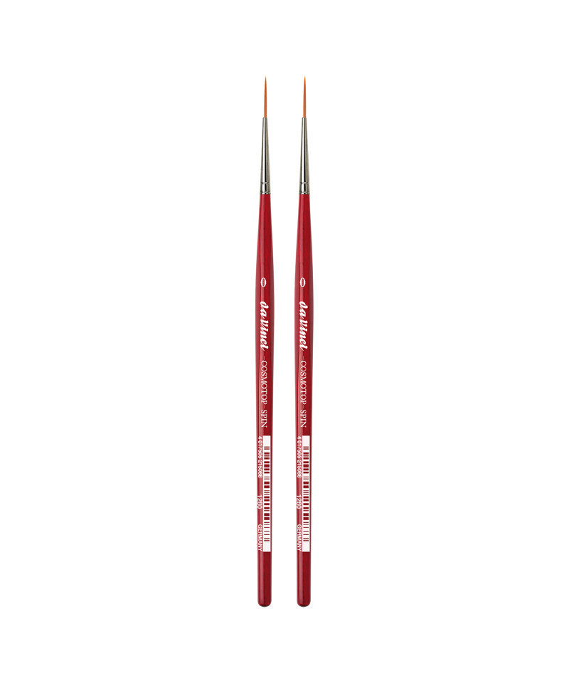 COSMOTOP-SPIN synthetics are great for watercolor, gouache, acrylic & ink. Spin holds more water than any other synthetic with a blend of 5 different diameters of extra smooth fiber ensuring the highest color-absorption of any synthetic brush. It has a sturdy construction and will retain its shape. Beautiful lacquered red handles and nickel-plated brass ferrules are rust proof. Hexagonal handles prevent the brush from rolling away. Certified green manufacturing with sustainable wood handles. Handmade in Germany at our family-owned factory since 1890. Sold as a pack of 2.