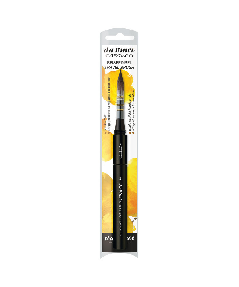 da Vinci's newest synthetic travel brush, features the first wavy fiber synthetic called CASANEO. CASANEO is a new "wavy" fiber synthetic developed by da Vinci for water media artists. Manufactured from extra smooth, slightly wavy synthetic fibers, CASANEO replicates the feel of natural squirrel hair but comes to a better point. This special construction allows the fibers to absorb a huge amount of water & color delivering an endless brush stroke. The brush is 100% vegan and is a favorite for watercolor, gouache, urban sketching, illustration, painting with inks or dyes and fluid acrylics. The brush has a flawless design as it screws together protecting the brush head for safe travels. It also has a drying hole so the brush will dry. Fits easily in a pocket or any painting set.