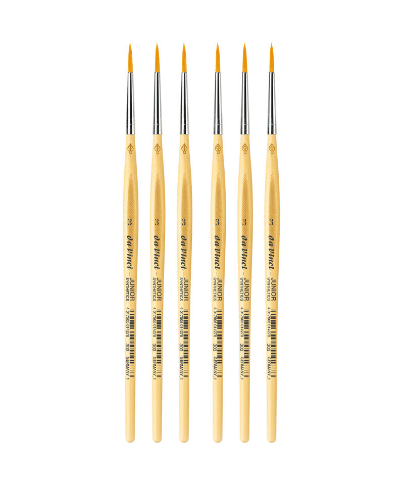 da Vinci Junior art brushes are a well built, easy to use brush developed to improve the quality of brushes for beginners. They can be used with any type of paint and are easy to clean. The "hold it like a pencil" handle shape makes for a comfortable and familiar grip. The brush won't roll away if dropped. It has a reinforced brush head for heavy wear that will always hold its edge. Unlike most cheaper brushes, da Vinci junior features a "rust resistant" seamless polished ferrule. Made in Germany. Sustainable wood handles. Vegan. Eco-Friendly. Sold as a pack of 6.