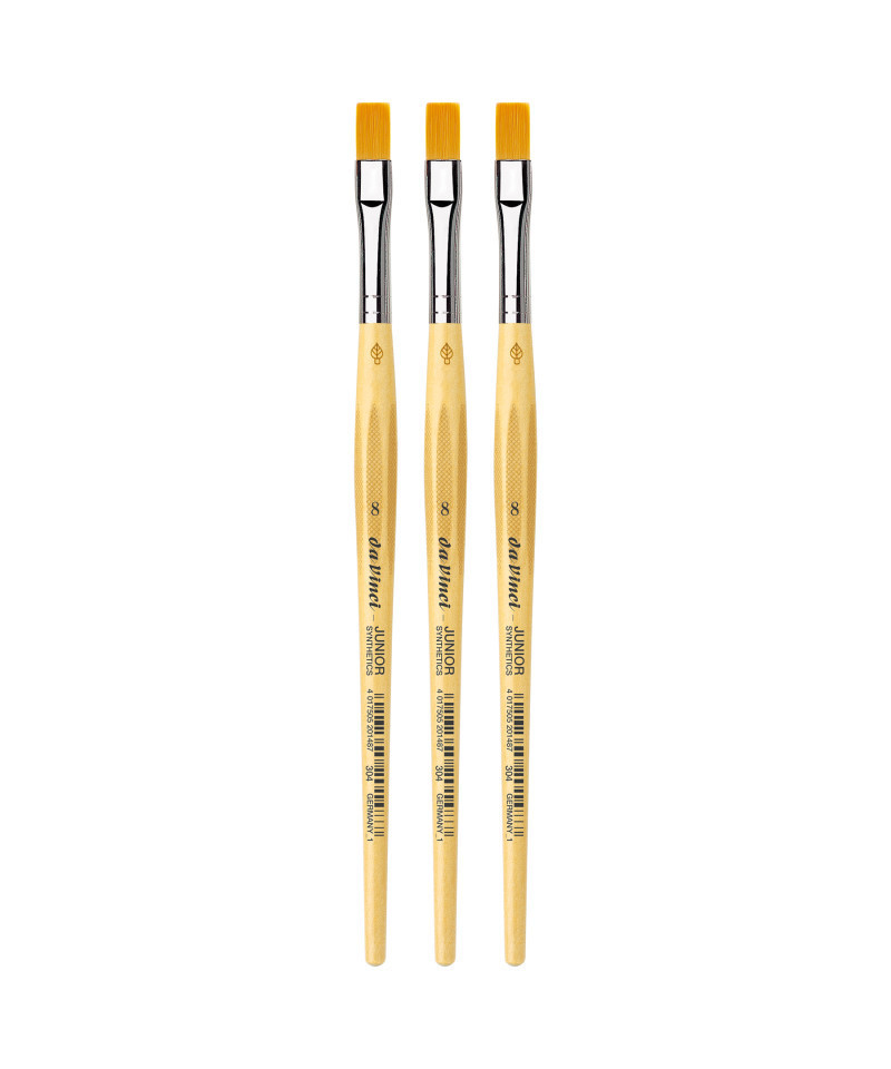 da Vinci Junior art brushes are a well built, easy to use brush developed to improve the quality of brushes for beginners. They can be used with any type of paint and are easy to clean. The "hold it like a pencil" handle shape makes for a comfortable and familiar grip. The brush won't roll away if dropped. It has a reinforced brush head for heavy wear that will always hold its edge. Unlike most cheaper brushes, da Vinci junior features a "rust resistant" seamless polished ferrule. Made in Germany. Sustainable wood handles. Vegan. Eco-Friendly. Sold as a pack of 3.