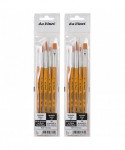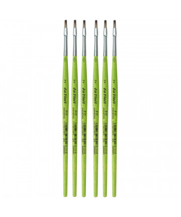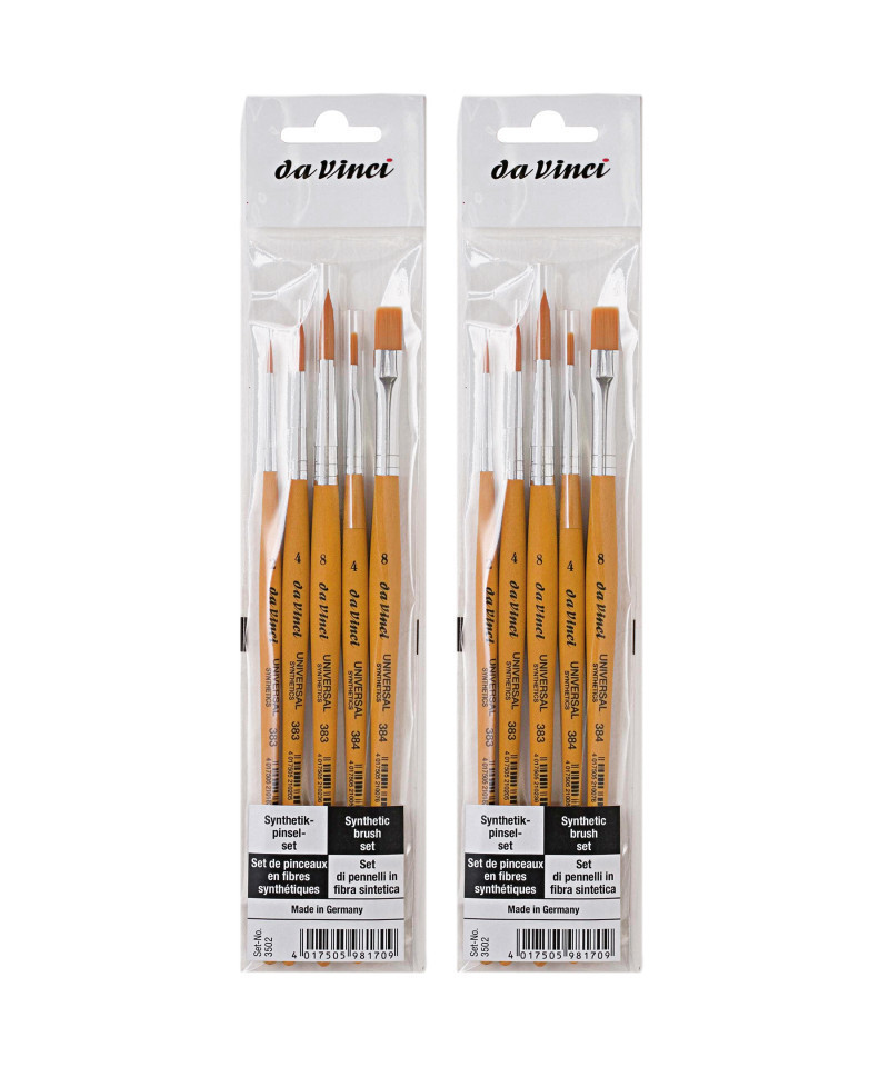 Universal synthetic brushes are suitable for all craft techniques and liquid colors. These brushes feature highly polished aluminum ferrules that resist rust and long orange matte handles. Certified eco-friendly, green manufacturing with sustainable wood handles made in Germany. Each set includes 5 brushes: Series 383 (Round) Size 2, 4 and 8 as well as Series 384 (Flat) Size 4 and 8. Sold as 2 sets for a total of 10 brushes.