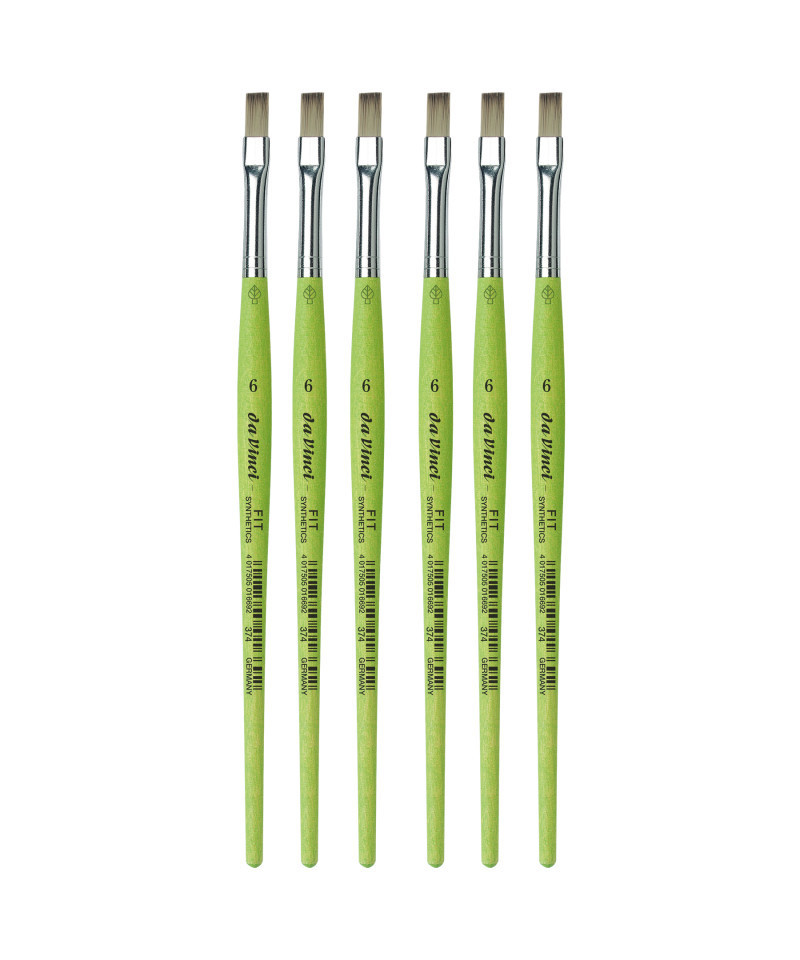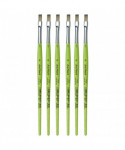 Thanks to a specifically developed, flexible, grey synthetic fiber we have created a hobby and school painting brush, which fascinates not only by its interesting look but also by its attractive price. This innovative product offers better performance than the traditional school brush with natural hair when it comes to stroke control and color absorbing capacity. The brush features a green, matte handle with seamless, rust-proof aluminum ferrules. Made in Germany. 100% Vegan. Sold as a pack of 6.