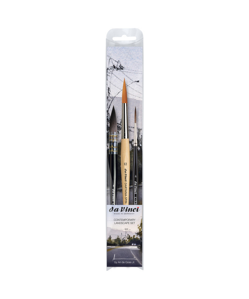 In cooperation with the well-known Brazilian Artist Ari de Goes Jr. we are happy to present a set composed according to his special needs. He prefers DARTANA-SPIN with the extremely long tip and the possible wide spectrum of larger and thinner lines, the CASANEO wash brush in size 4 for the color-holding capacity and the CASANEO rigger for precise strokes. In recent years his works have gained a lot of attention internationally. "My set provides in my watercolors, exactly what I need for washes, precise structures and thin lines. Enjoy it!" – Ari de Goes Jr. This set contains 3 brushes: Series 1290 Size 4, Series 188 Size 12 and Series 498 Size 4.