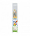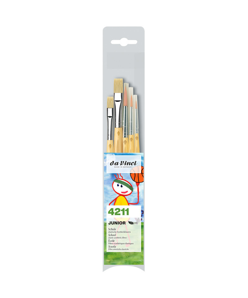 da Vinci Junior art brushes are a well built, easy to use brush developed to improve the quality of brushes for beginners. They can be used with any type of paint and are easy to clean. The "hold it like a pencil" handle shape makes for a comfortable and familiar grip. The brush won't roll away if dropped. It has a reinforced brush head for heavy wear that will always hold its edge. Unlike most cheaper brushes, da Vinci junior features a "rust resistant" seamless polished ferrule. Made in Germany. Sustainable wood handles. Vegan. Eco-Friendly. This set contains: Series 303 Size 2, 4 and 8 as well as Series 329 Size 8 and 12.