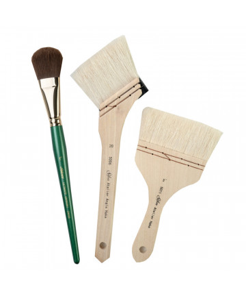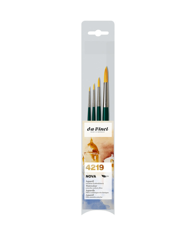 NOVA golden synthetic brushes for all paints & painting techniques - in many different shapes. This line has been one of our best-sellers for decades. Our well-known mix of synthetic fibers of 3 different diameters with a high color absorbing capacity for smooth and even strokes. Certified green manufacturing with sustainable wood handles handmade in Germany at our family-owned factory since 1890. 100% Vegan. This set contains: Series 1570 Size 0, 2, 6 and 12.