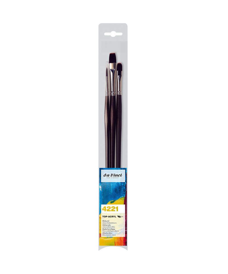 Extra strong and stiff for acrylics, oils & water-mixable oils TOP-ACRYL is constructed with 5 different diameters of extra strong Synthetic Bristle. Long handles fit right in your painting box or travel easel. Exclusive design developed by da Vinci. Extra stiff with a precise snap, and a favorite of Impasto painters (who use thick applications of paint). Whether massing color in the larger sizes or precision painting in the smaller sizes, TOP-ACRYL brushes offer the artist versatility and ruggedness. The brush features a long, lacquered hexagonal handle. This set includes: Series 7185 Size 12, Series 7485 Size 8 and Series 7785 Size 4.