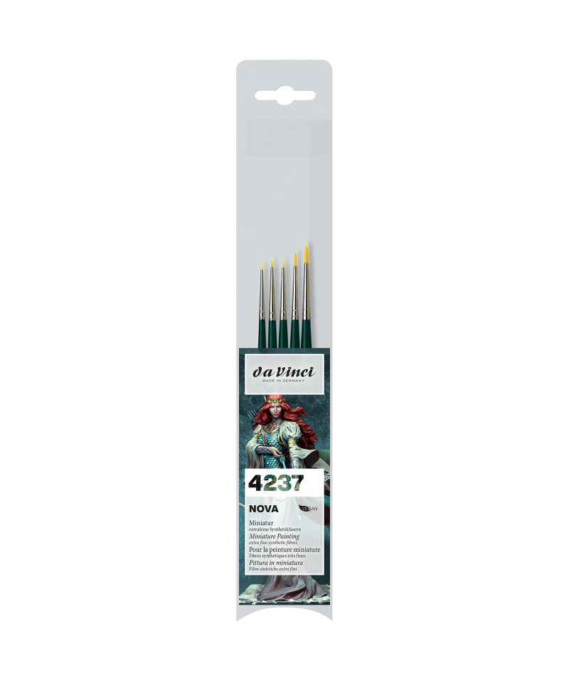 NOVA golden synthetic brushes for all paints & painting techniques - in many different shapes. This line has been one of our best-sellers for decades. Our well-known mix of synthetic fibers of 3 different diameters with a high color absorbing capacity for smooth and even strokes. Certified green manufacturing with sustainable wood handles handmade in Germany at our family-owned factory since 1890. 100% Vegan. This set contains: Series 1570 Size -10, -5, -3, 0 and 2.