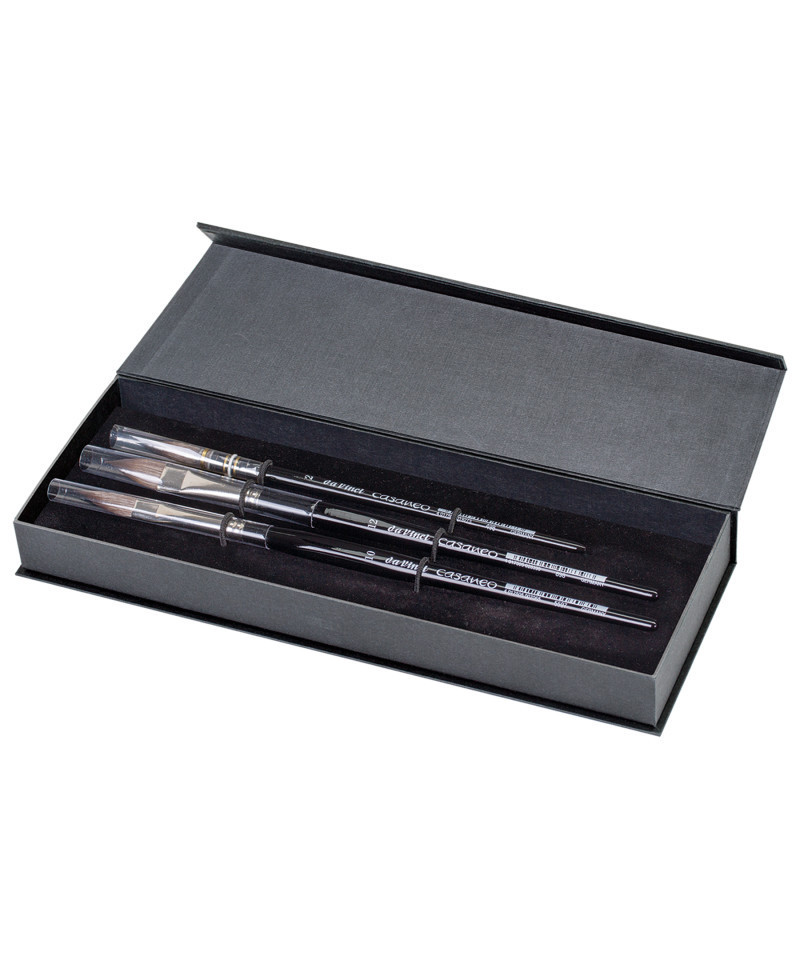 Sets stay closed while traveling by the magnetic snap, also makes a beautiful painterly gift. CASANEO features a new "wavy" fiber developed by da Vinci that allows for high color absorption and a soft feel while still coming to a perfect point or edge. This special construction allows the fibers to absorb a huge amount of water & color delivering an endless brush stroke. Excellent for watercolor, gouache, acrylic, silk painting, calligraphy and ink and for urban sketching. Made in Germany, certified green manufacturing with sustainable wood handles from European forests. This set contains 3 brushes: Series 498 Size 2, Series 5597 Size 10 and Series 898 Size 12.