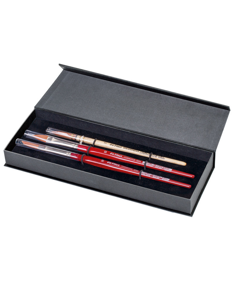 COSMOTOP-SPIN synthetics are great for watercolor, gouache, acrylic & ink. Spin holds more water than any other synthetic with a blend of 5 different diameters of extra smooth fiber ensuring the highest color-absorption of any synthetic brush. It has a sturdy construction and will retain its shape. Beautiful lacquered red handles and nickel-plated brass ferrules are rust proof. Hexagonal handles prevent the brush from rolling away. With the practical da Vinci cotton brush bag the brushes are always organized and well protected, at home or on the road. Certified green manufacturing with sustainable wood handles. Handmade in Germany at our family-owned factory since 1890. This set includes Series 488 Size 2, Series 5584 Size 12 and Series 5587 Size 10.