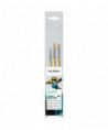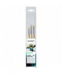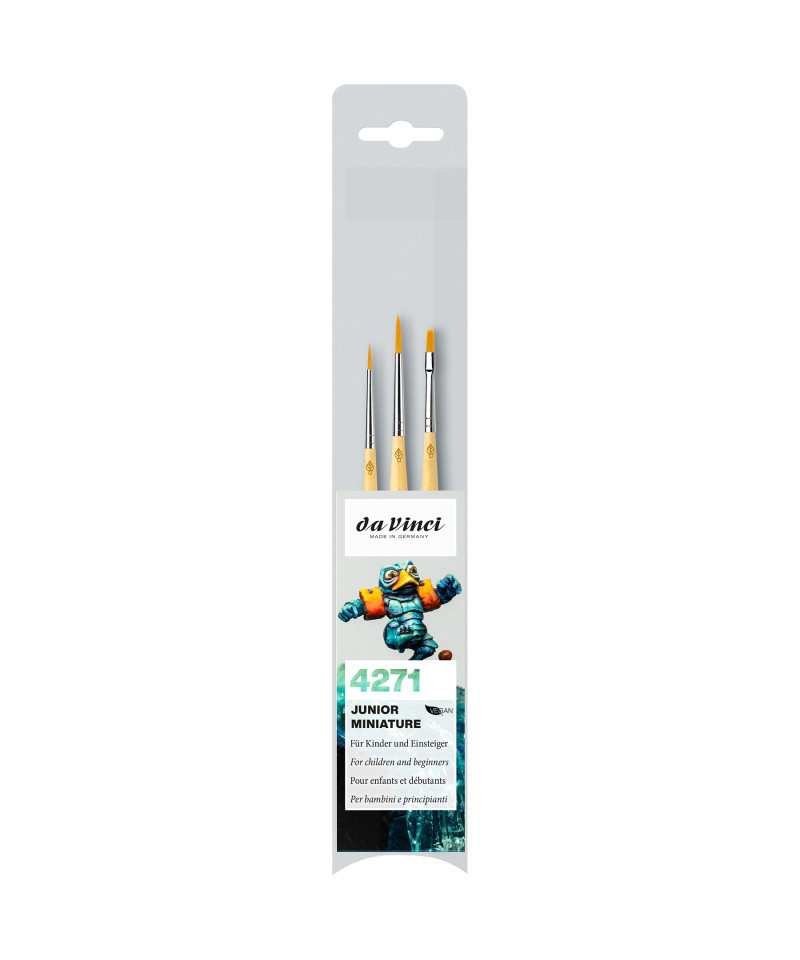 da Vinci Junior art brushes are a well built, easy to use brush developed to improve the quality of brushes for beginners. They can be used with any type of paint and are easy to clean. The "hold it like a pencil" handle shape makes for a comfortable and familiar grip. The brush won't roll away if dropped. It has a reinforced brush head for heavy wear that will always hold its edge. Unlike most cheaper brushes, da Vinci junior features a "rust resistant" seamless polished ferrule. Made in Germany. Sustainable wood handles. Vegan. Eco-Friendly. This set contains: Series 303 Size 1 and 3 as well as Series 304 Size 2.