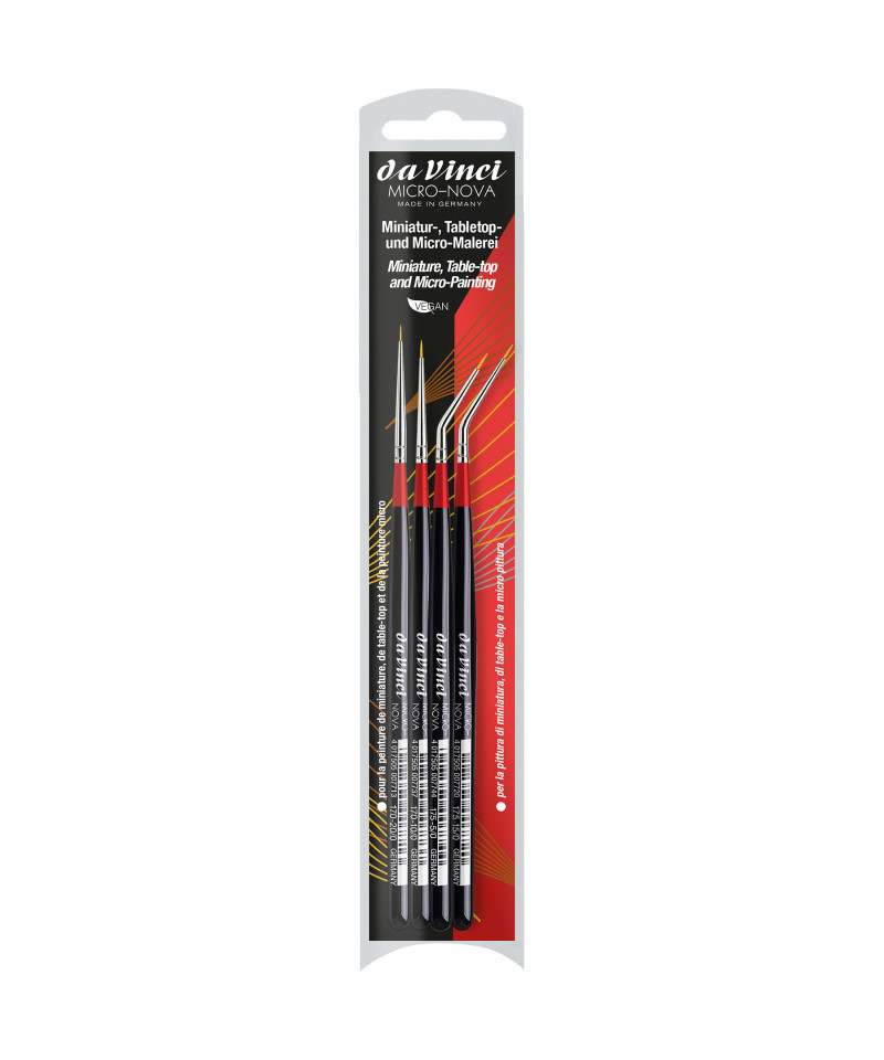 The da Vinci MICRO-NOVA has a very short handle format that will not roll away for precision painting, retouch, modeling, restoration or spot painting. This line of brushes features NOVA Synthetic fibers that work well with all types of paint. Certified green manufacturing with sustainable wood handles handmade in Germany at our family owned factory since 1890. 100% Vegan. This set includes: Series 170 Size -20 and -10 as well as Series 175 Size -15 and -5.