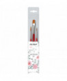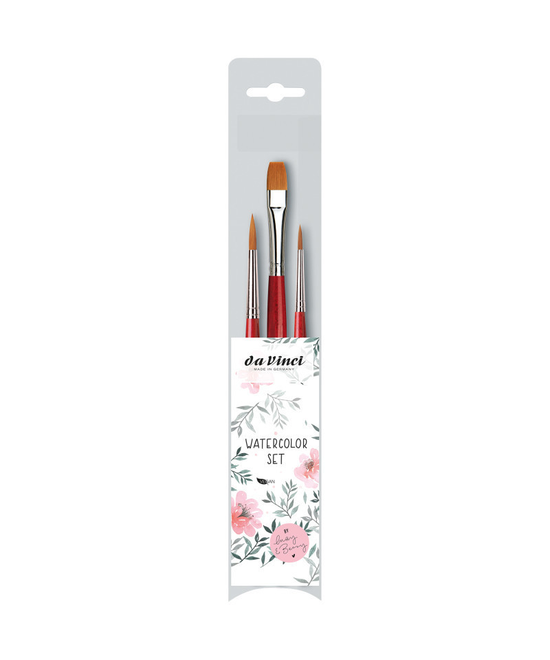 Together with the very successful author duo May & Berry, we offer a set using their recommendations for Lettering and Flowers. COSMOTOP-SPIN synthetics are great for watercolor, gouache, acrylic & ink. Spin holds more water than any other synthetic with a blend of 5 different diameters of extra smooth fiber ensuring the highest color-absorption of any synthetic brush. It has a sturdy construction and will retain its shape. Beautiful lacquered red handles and nickel-plated brass ferrules are rust proof. Certified green manufacturing with sustainable wood handles. Handmade in Germany at our family-owned factory since 1890. This set contains 3 COSMOTOP-SPIN brushes: Series 5580 (Round) Size 3 and 6 as well as Series 5880 (Flat) Size 12.