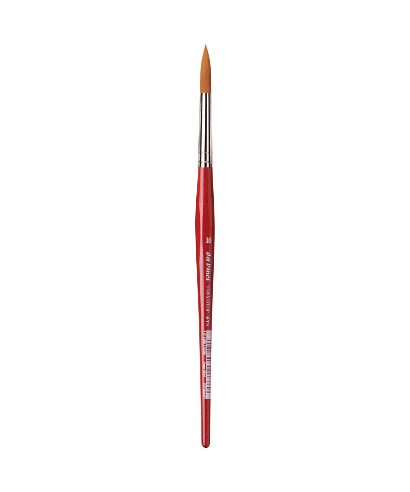 COSMOTOP-SPIN synthetics are great for watercolor, gouache, acrylic & ink. Spin holds more water than any other synthetic with a blend of 5 different diameters of extra smooth fiber ensuring the highest color-absorption of any synthetic brush. It has a sturdy construction and will retain its shape. Beautiful lacquered red handles and nickel-plated brass ferrules are rust proof. Hexagonal handles prevent the brush from rolling away. Certified green manufacturing with sustainable wood handles. Handmade in Germany at our family-owned factory since 1890.