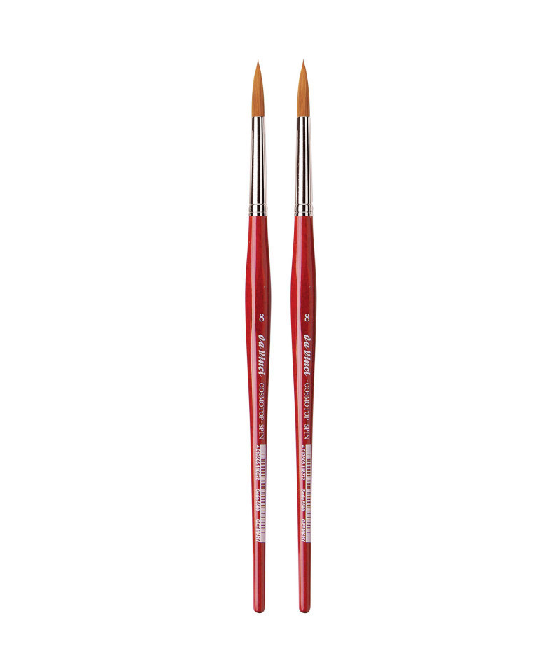 COSMOTOP-SPIN synthetics are great for watercolor, gouache, acrylic & ink. Spin holds more water than any other synthetic with a blend of 5 different diameters of extra smooth fiber ensuring the highest color-absorption of any synthetic brush. It has a sturdy construction and will retain its shape. Beautiful lacquered red handles and nickel-plated brass ferrules are rust proof. Hexagonal handles prevent the brush from rolling away. Certified green manufacturing with sustainable wood handles. Handmade in Germany at our family-owned factory since 1890. Sold as a pack of 2.