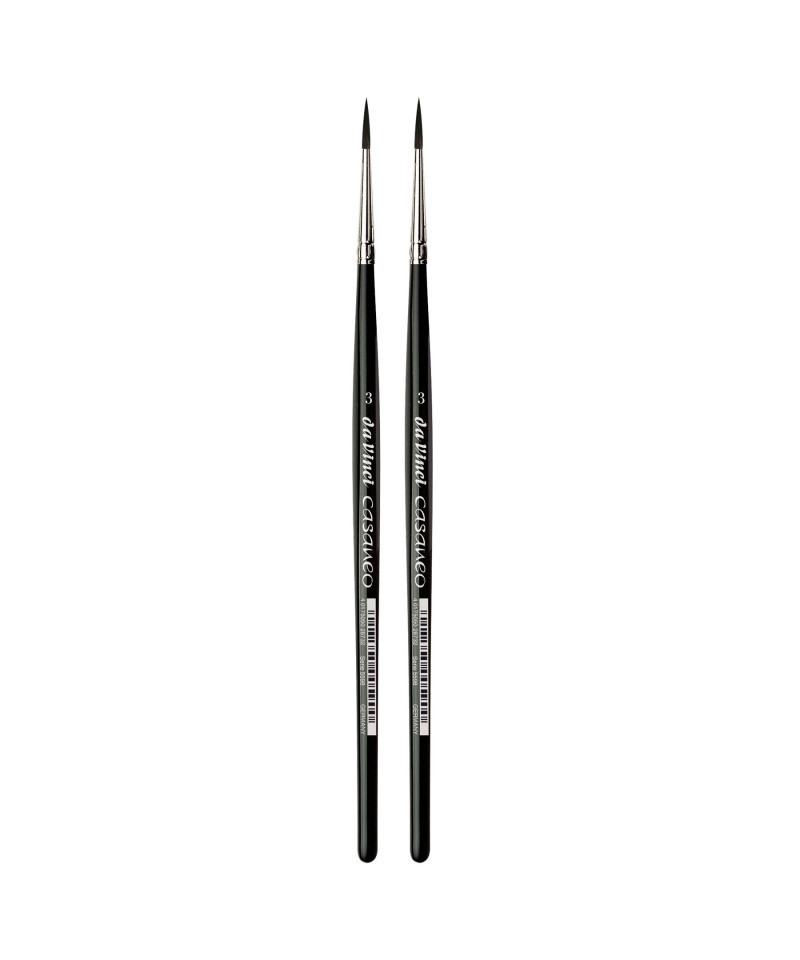 CASANEO is a new "wavy" fiber synthetic developed by da Vinci for water media artists. Manufactured from extra smooth, slightly wavy synthetic fibers, CASANEO replicates the feel of natural squirrel hair but comes to a better point. This special construction allows the fibers to absorb a huge amount of water & color delivering an endless brush stroke. The brush features a short, black, polished, hexagonal handle. Ideal for watercolor, gouache, fluid acrylics & ink painting. Made in Germany. 100% Vegan. Handles are from sustainable forests in the Baltic states. Eco friendly manufacturing. Sold as a pack of 2.