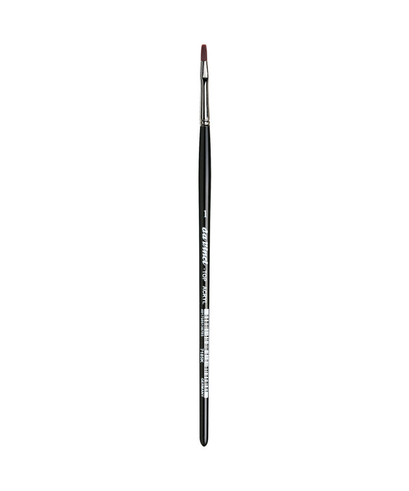 Extra strong and stiff for acrylics, oils & water-mixable oils TOP-ACRYL is constructed with 5 different diameters of extra strong Synthetic Bristle. Short "no-roll" handles fit right in your smaller painting box or travel easel. Exclusive design developed by da Vinci. Extra stiff with a precise snap, and a favorite of Impasto painters (who use thick applications of paint). Whether massing color in the larger sizes or precision painting in the smaller sizes, TOP-ACRYL brushes offer the artist versatility and ruggedness. This brush features short, black, polished, hexagonal handles that prevent the brush from rolling away and the hand from getting tired during painting.
