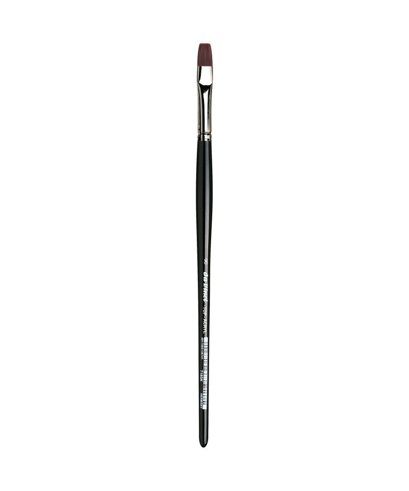 Extra strong and stiff for acrylics, oils & water-mixable oils TOP-ACRYL is constructed with 5 different diameters of extra strong Synthetic Bristle. Short "no-roll" handles fit right in your smaller painting box or travel easel. Exclusive design developed by da Vinci. Extra stiff with a precise snap, and a favorite of Impasto painters (who use thick applications of paint). Whether massing color in the larger sizes or precision painting in the smaller sizes, TOP-ACRYL brushes offer the artist versatility and ruggedness. This brush features short, black, polished, hexagonal handles that prevent the brush from rolling away and the hand from getting tired during painting.