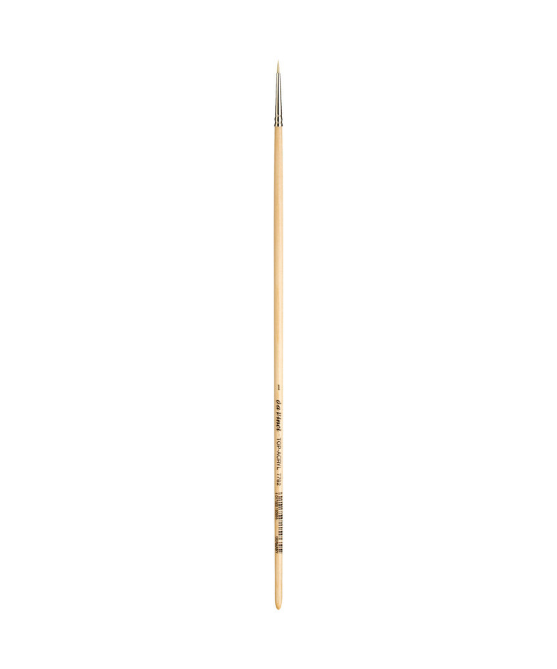 Extra strong and stiff for acrylics, oils & water-mixable oils TOP-ACRYL is constructed with 5 different diameters of extra strong Synthetic Bristle. Long handles fit right in your painting box or travel easel. Exclusive design developed by da Vinci. Extra stiff with a precise snap, and a favorite of Impasto painters (who use thick applications of paint). Whether massing color in the larger sizes or precision painting in the smaller sizes, TOP-ACRYL brushes offer the artist versatility and ruggedness. The brush features a long, natural, polished handle.