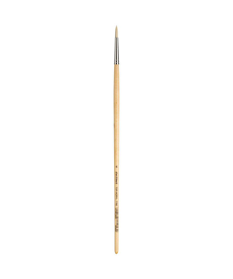 Extra strong and stiff for acrylics, oils & water-mixable oils TOP-ACRYL is constructed with 5 different diameters of extra strong Synthetic Bristle. Long handles fit right in your painting box or travel easel. Exclusive design developed by da Vinci. Extra stiff with a precise snap, and a favorite of Impasto painters (who use thick applications of paint). Whether massing color in the larger sizes or precision painting in the smaller sizes, TOP-ACRYL brushes offer the artist versatility and ruggedness. The brush features a long, natural, polished handle.