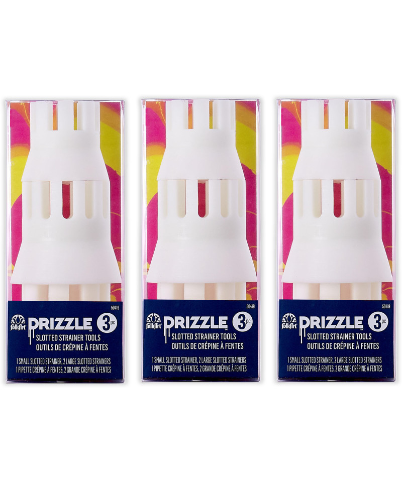 Acrylic paint pouring has never been easier than with the FolkArt Drizzle Slotted Strainer Tool Set. These slotted strainers will give your fluid art different visual effects to make a unique piece of art with FolkArt Drizzle Premium Pre-Mixed Fluid Pouring Acrylic Paint. Express yourself through loose and colorful art with these handy tools and ready-to-pour colors! Great for a variety of fluid art techniques - perfect for letting your creativity flow. There are no two pours that are alike! Explore and experience the freedom of expression through your fluid paintings and creations with each of these durable acrylic pouring paint supplies. Unleash your creativity with FolkArt Drizzle Slotted Strainer Tool Set! Free your mind, free your color! Each set includes 3 pieces, two large and one small slotted strainer. Sold as 3 sets for a total of 9 pieces.