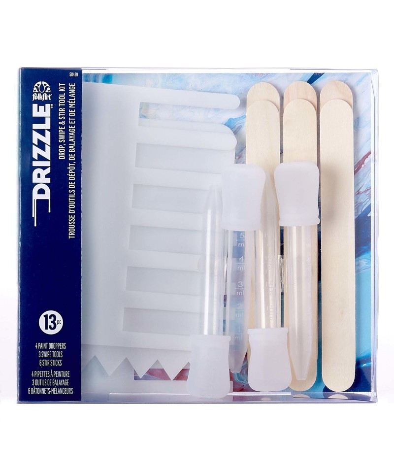 Acrylic paint pouring has never been easier than with the FolkArt Drizzle Pouring Drop, Swipe, and Stir Tool Kit. This 13-piece tool kit provides you with a variety of tools to give your fluid art different visual effects when you use this kit with FolkArt Drizzle Premium Pre-Mixed Fluid Pouring Acrylic Paint. This kit includes 4 paint droppers, 6 wood stir sticks, and 3 swipe tools. Express yourself through loose and colorful art with these handy tools and ready-to-pour colors! Great for a variety of fluid art techniques - perfect for letting your creativity flow. There are no two pours that are alike! Explore and experience the freedom of expression through your fluid paintings and creations with these durable acrylic pouring paint supplies. Unleash your creativity with FolkArt Drizzle Pouring Drop, Swipe, and Stir Tool Kit! Free your mind, free your color!