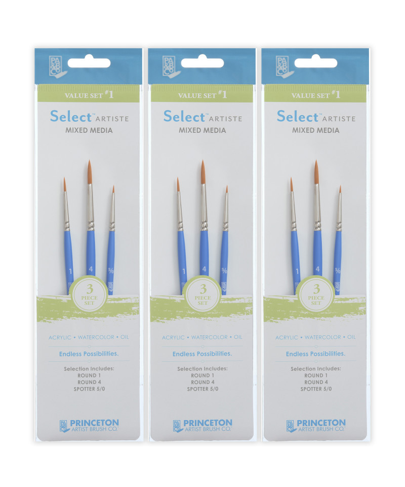Princeton Select Artiste Brush Set No. 1, Synthetic Bristles, Short Handle Mixed Media Paintbrush, Jewel Blue, 3 Per Set, 3 Sets