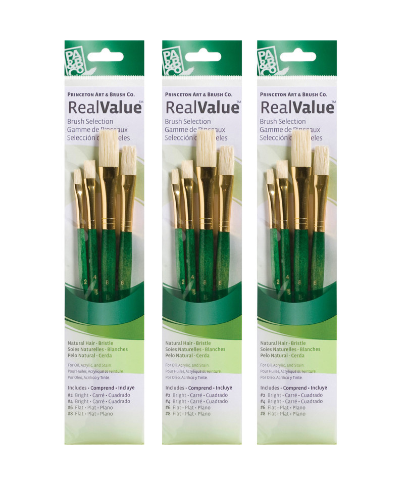Princeton RealValue Brush Set, Natural Bristles, Short Handle Mixed Media Paintbrush, Green, 4 Per Set, 3 Sets
