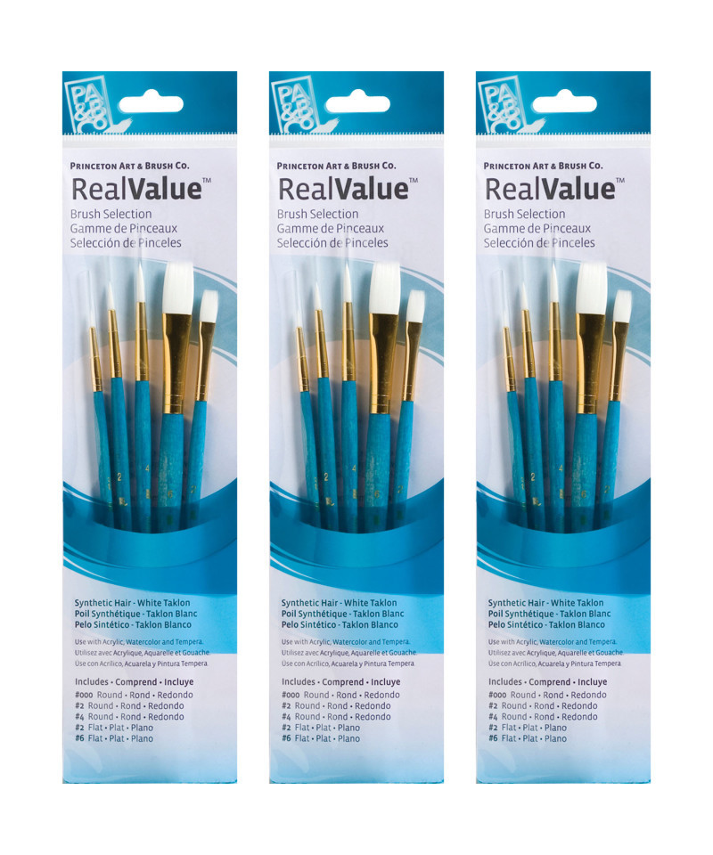 Princeton Artist Co. proudly presents the RealValue paintbrush collection—a curated series of meticulously selected brush sets that cater to every artistic need. Whether you prefer short-handle or long-handle styles, natural, synthetic, or a blend of bristles, the RealValue collection offers an unparalleled range of shapes and sizes. Designed to meet the demands of artists across all mediums—acrylic, watercolor, tempera, and oil—these brushes deliver exceptional mixed media performance at an incredible value. With RealValue, you'll find the perfect brush set to elevate your craft, whether you're just beginning or are a seasoned professional. Each set includes 5 brushes. Sold as 3 sets for a total of 15 brushes.