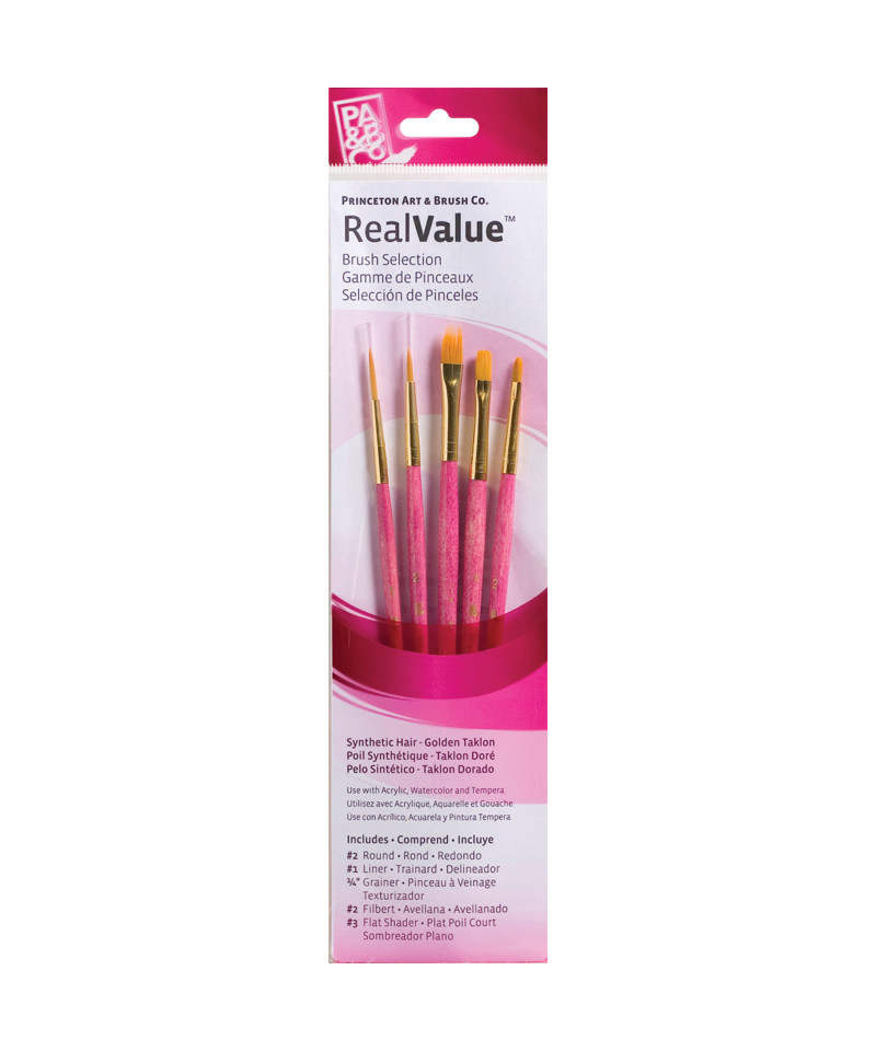 Princeton RealValue Brush Set, Gold Taklon Bristles, Short Handle Mixed Media Paintbrush, Pink, 5 Pieces