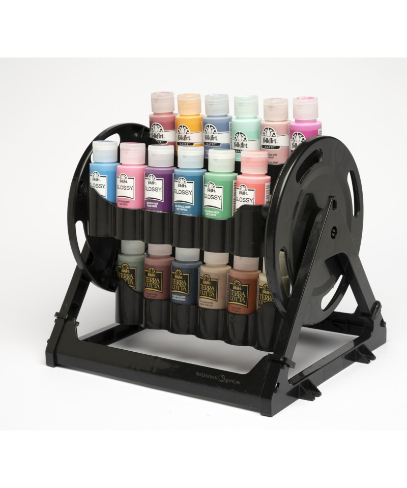 The Plaid Rotational Organizer is the perfect way to keep your craft studio neat and tidy. This handy acrylic paint rack holds up to 24 standard 2 oz bottles of your favorite FolkArt or Apple Barrel Acrylic Paint colors. You can easily and systematically use each section to organize your paints by color palette or store your favorite acrylic paint set. This compact and easy-to-use organizer can easily be mounted on a wall, used on a tabletop, or under a cabinet. Simply snap together this portable organizer to effortlessly transport your favorite colors from one project to the next. This durable and lightweight storage unit is a must-have product in your art supplies to keep your acrylic paints organized any time creativity strikes.