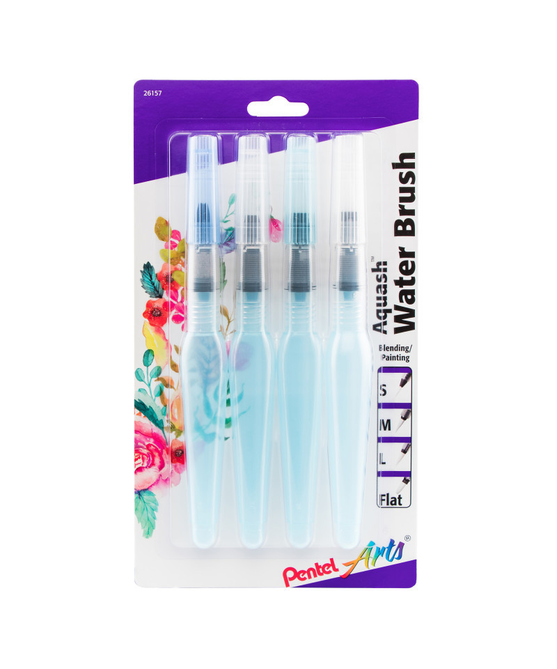 Create a watercolor masterpiece with the Aquash Water Brush. Fill barrel with water, and blend powdered pigment, watercolor crayons and pencils, pastels and more. These brushes are ideal to use with the Pentel Arts Sign Pen Brush products. Easy to control the water flow with just a squeeze of the barrel, and the durable nylon tip gives a sensitive response for delicate lines and pools of water. Easy to clean and dishwasher friendly, and contain four assorted brush sizes; small, medium, large and flat.