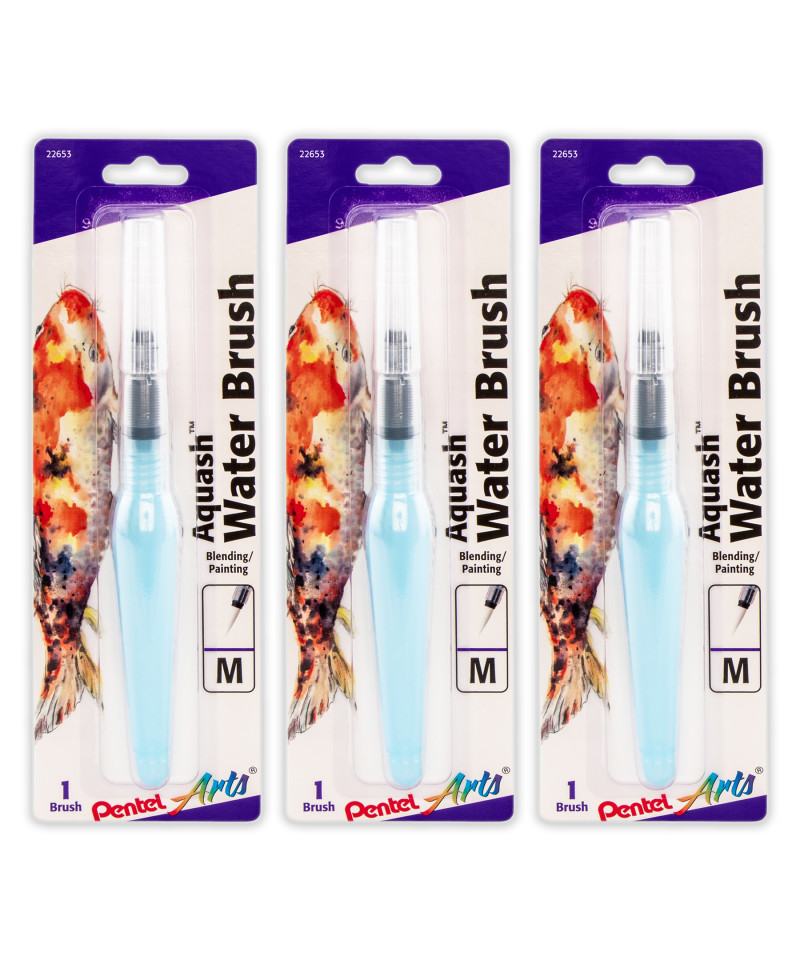 Create a watercolor masterpiece with the Aquash Water Brush. Fill barrel with water, and blend powdered pigment, watercolor crayons and pencils, pastels and more. These brushes are ideal to use with the Pentel Arts Sign Pen Brush products. Easy to control the water flow with just a squeeze of the barrel, and the durable nylon tip gives a sensitive response for delicate lines and pools of water. Easy to clean and dishwasher friendly. Sold as a pack of 3 medium, fine tip Water Brushes.