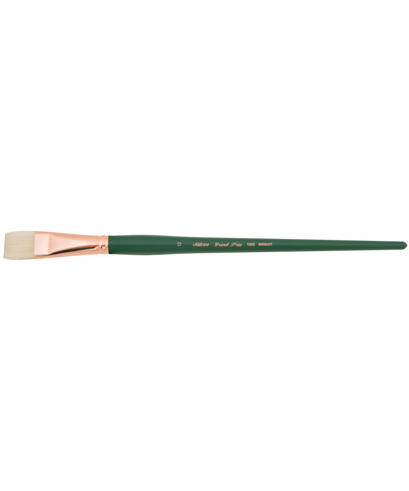 The Silver Brush Grand Prix line has been used to paint political portraits, including US Presidents and First Ladies. Each brush has excellent paint-holding capabilities and is well balanced. This line offers brushes with interlocking bristles and natural flags. Grand Prix professional brushes are expertly crafted with elite-quality hog bristle. Each brush has a long matte-green handle that reduces glare and is finished with a sophisticated, corrosion-resistant, copper ferrule. The tight stroke control, Bright brushes are superior tools to use when creating abstract designs or cityscapes. Silver Brush Bright brushes can also be used for color blocking. The long handle is ideal for easel canvas painting.