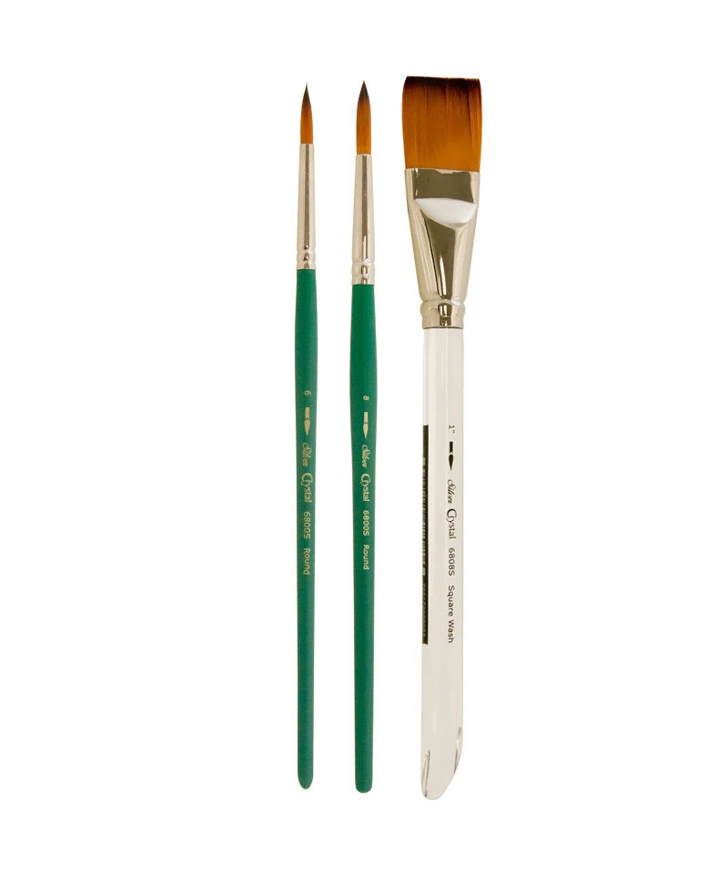Silver Brush Crystal brushes were created for oil and watercolor artists. These oil and watercolor brushes have a bountiful spring that makes them ideal for a variety of painting styles. They have excellent color retention for less reloading. This unique paintbrush series is handcrafted from exclusive durable brown-tip golden filaments set into nickel-plated double crimped brass ferrules and fitted to beautifully balanced short matte teal handles. This kit includes the Crystal Round & Square Wash brushes, in 2 & 1 sizes. These brushes are ideal for line work, backgrounds, abstract designs, and rounded shapes. Short-handled brushes are best for easel painting. Silver Brush Crystal artist brushes are best paired with oil or watercolor. Each brush will hold the right amount of color, giving you more time to focus on your art. Watch your ethereal creations come to life with Silver Brush premium-quality brushes. Each set includes 3 brushes: 1 each of Crystal™ Round, Size 6 and 8, and 1 Crystal™ Square Wash, Size 1/2".