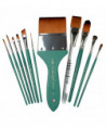Quality artist's brushes for watercolor, acrylics, gouache, inks, dyes and all water media. Crystal™ brushes hold a generous amount of color that releases evenly and allows the brush to glide smoothly over paper. Adds layers and stroke over stroke. Resists puddling and drips. Carries color reliably from palette to painting surface. Manufactured with Silver Brush exclusive durable brown-tip golden filaments set into nickel-plated double crimped brass ferrules and fitted to beautifully balanced short matte teal handles. Crystal™ from Silver Brush, outlasts, outperforms, works harder than all other brushes in this class. Crystal™ synthetic brushes add durability and spring to each painting stroke. Crystal™ artist brushes are made to exacting detail. Perfect in acrylic, watercolors and all water media. Try Crystal in inks and dyes too. 6800S: Round artist brushes are the most popular shape. Paint fine lines, detail, overall washes and stroke work. 6802S: Bright artist brushes have a square tip that make great lines and shading. Use the flat end to create geometrical shapes and designs. 6803S: Filbert artist brush has a rounded tip and makes for an organic curved mark. This brush will lay down color softly enough not to disturb the color underneath. 6806S: Angle artist brushes are made to exacting detail. The angle brush is perfect for quick and tight draw downs. Controls color on surfaces. Make a beautiful flower petal with just one stroke. A must for every artist's studio. Series 6808S Square Wash has clear acrylic handles with beveled tips for separating sheets from a watercolor block and scraping paint for intricate design work. 6809S Pointed Oval brush, add sweeping broad strokes to your painting. Able to make unique shapes for petals, faces, landscapes and more. Perfect in acrylic and watercolors. Try Crystal in inks and dyes too. 6814S Crystal™, wide wash brush. Golden Taklon brushes for background painting. Use in washes, blending, adding color to large painting surface. Set includes 11 different brushes in assorted shapes and sizes.
