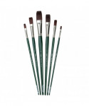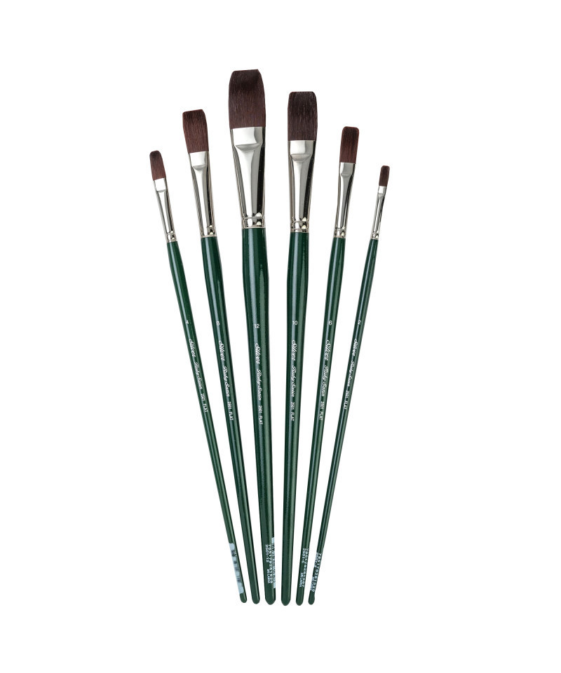 Ruby Satin® series brushes are handmade by expert artisans who undergo extensive training before they are skilled enough to produce the kind of quality that has become synonymous with Silver Brush Limited. Ruby Satin® fine artist brushes feature multi-diameter synthetic filaments that carry heavy bodied paints effortlessly across your painting surface. This series is stiff, durable and snappy with fine points and chiseled edges for crisp, clean strokes. Ruby Satin® allows artists to work with thicker media for superior color mixing and line quality. Ruby Satin® series are rugged enough to withstand rough treatment on textured surfaces. These brushes imitate natural hog bristle, so expect textured strokes and excellent paint carrying capacity. Ruby Satin® long handle, all size flat brushes, are the perfect investment for anyone taking their artwork seriously. These brushes will pay dividends over the years to come. Rugged, long lasting, durable are the key elements to these brushes. Ruby Satin® is a quality synthetic brush with the shape and feel of interlocked bristles. These beauties have a precise snap and excellent color control, no matter if you are using extra heavy bodied acrylics, oils or water-mixable oils. A seamless, nickel-plated brass ferrule and an epoxy seal offer additional protection to the bristles so you can paint with confidence on wood, canvas, and tough surfaces. This set of brushes include 6 different Flat Ruby Satin brushes in different sizes: #2, #4, #6, #8, #10, #12. Silver Brush Ltd is owned by a 4th generation art materials family and proud of Silver Brush rich heritage in bringing quality supplies to artists and craftsmen throughout the world. We delight in challenging the status quo and putting Silver Brush experience to work for you because Art is for Everyone!